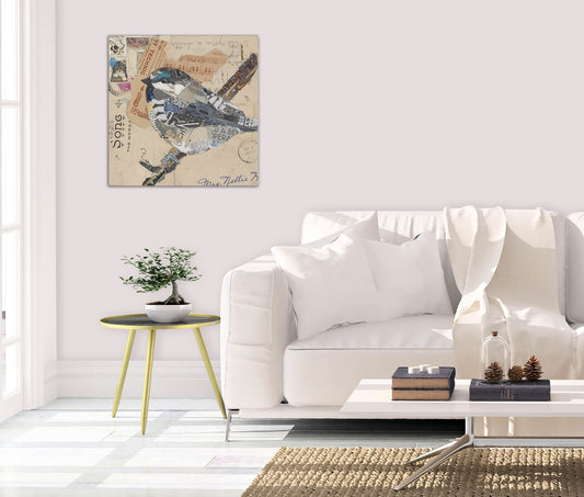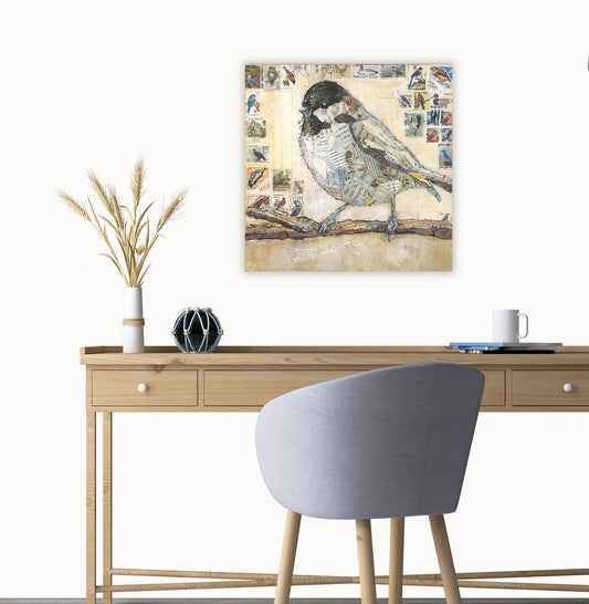 Chickadee with Stamps Collage Wall Art by Jacquie Masterson